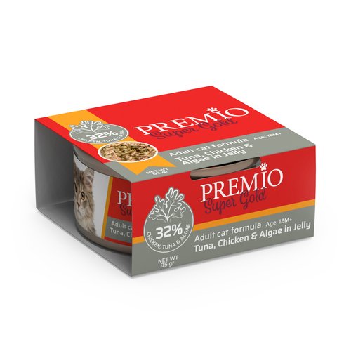 פרמיו מעדן לחתול בוגר-נתחוני טונה,עוף ואצות בג'לי 85 גרם