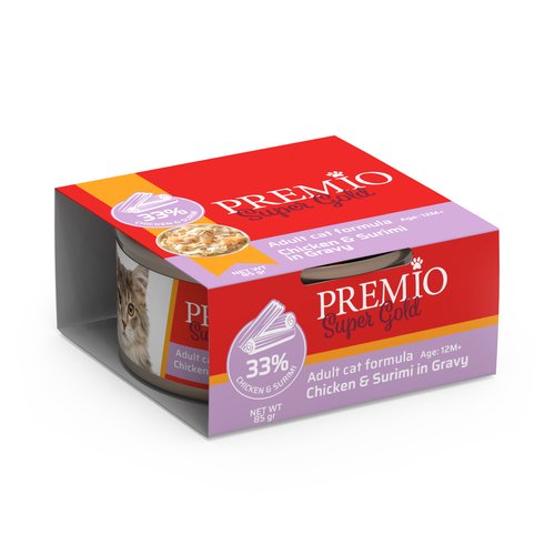 פרמיו מעדן לחתול בוגר-נתחוני עוף וסורימי בג'לי 85 גרם