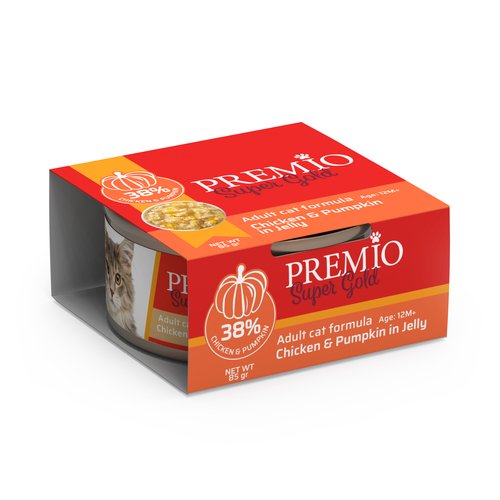 פרמיו מעדן לחתול בוגר-נתחוני עוף ודלעת בג'לי 85 גרם