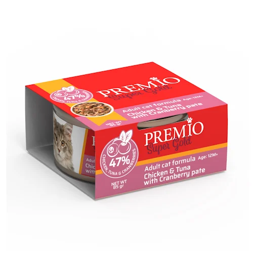 שימורי פרמיו סופר גולד פטה עוף טונה וחמוציות 85 גרם